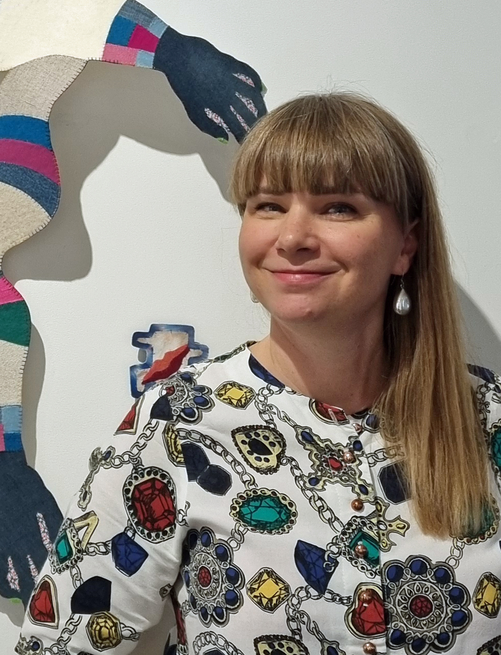 Riina Kauppis intresse för hållbarhetsfrågor visar sig även i hennes val av material. Hennes teknik är textil intarsia och hon arbetar med färgrika, ofta lekfulla former.